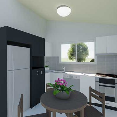 - Large designer kitchen with overhead cupboards, provision for microwave and dishwasher