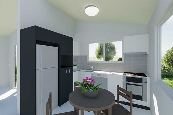 - Large designer kitchen with overhead cupboards, provision for microwave and dishwasher