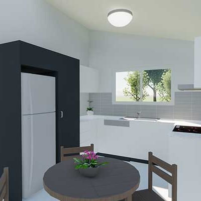 - Large designer kitchen with overhead cupboards, provision for microwave and dishwasher